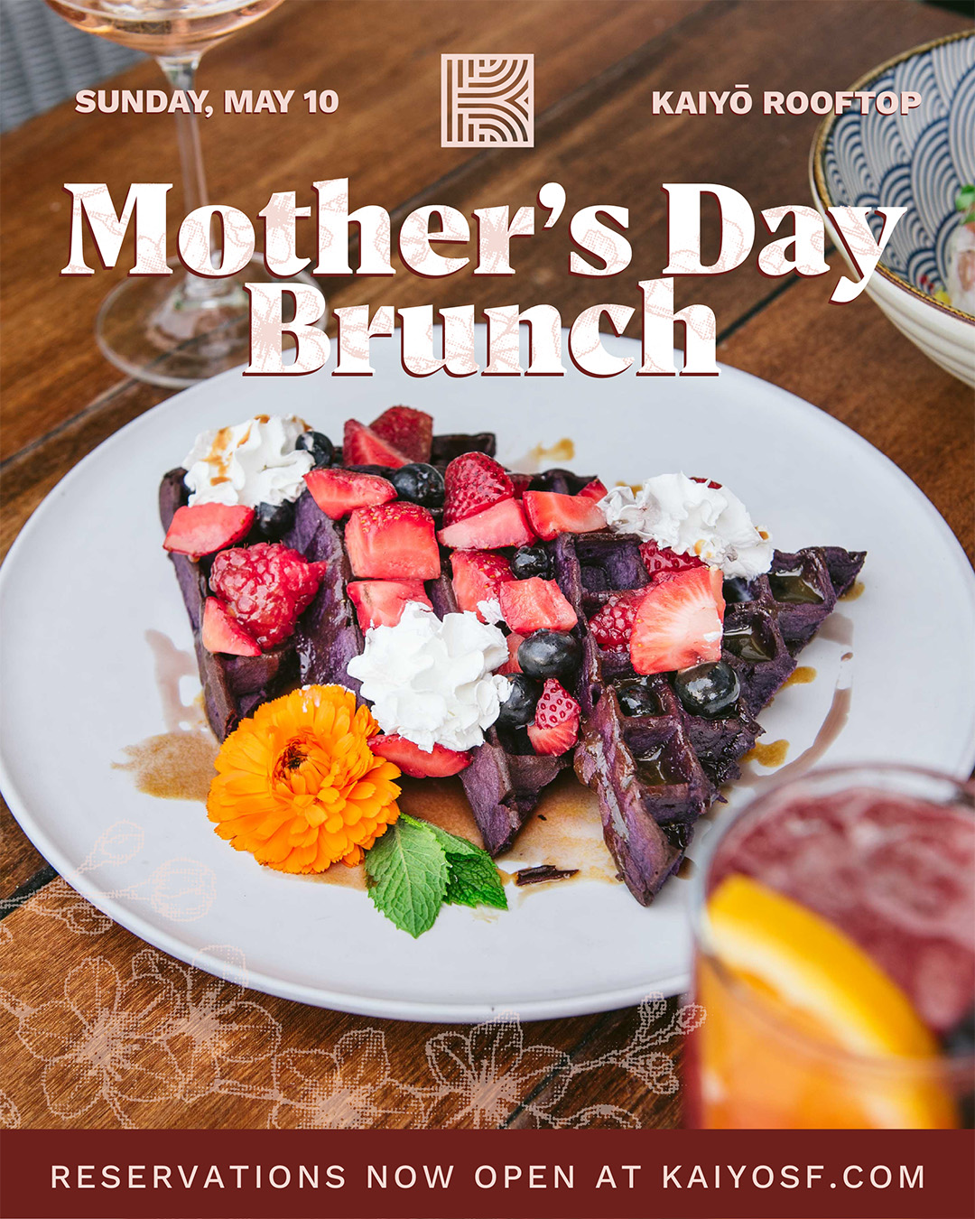 Twelve floors above, KAIYŌ Rooftop Bar is a tropical oasis in the sky featuring a more casual, yet refined experience. Lush greenery, rich textures, skyline views, and a cocktail-forward menu set the scene for an unforgettable night out in San Francisco.